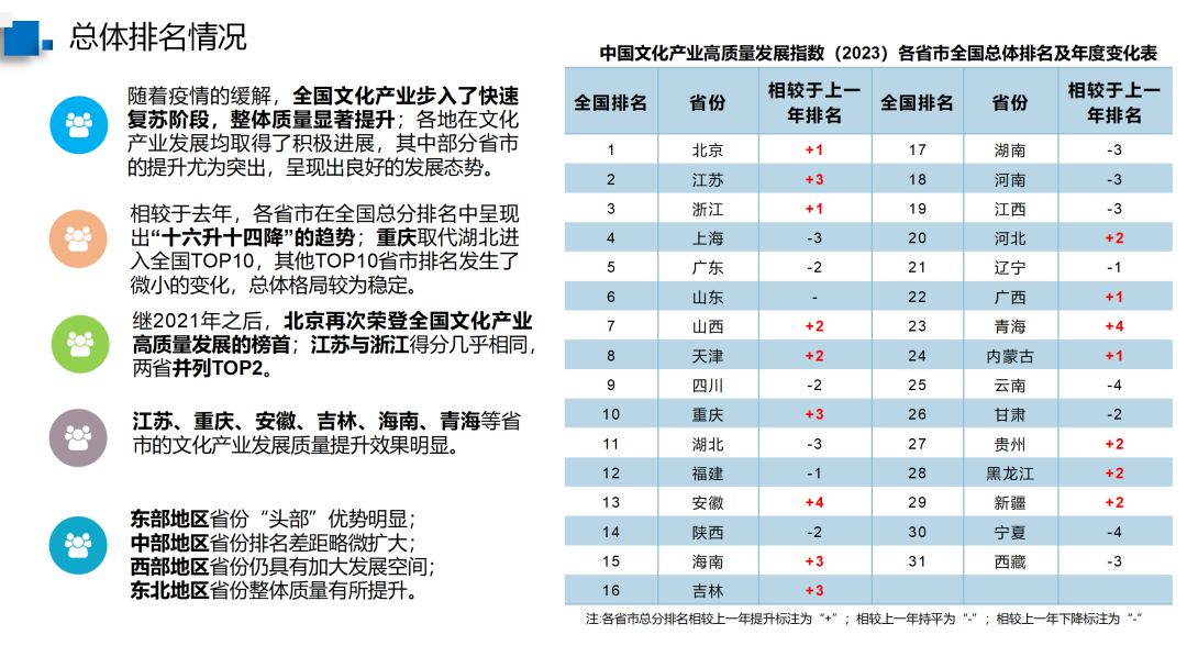随着疫情的缓解,全国文化产业步入了快速复苏阶段,整体质量显著提升;各地在文化产业发展均取得了积极进展,其中部分省市的提升尤为突出,呈现出良好的发展态势。